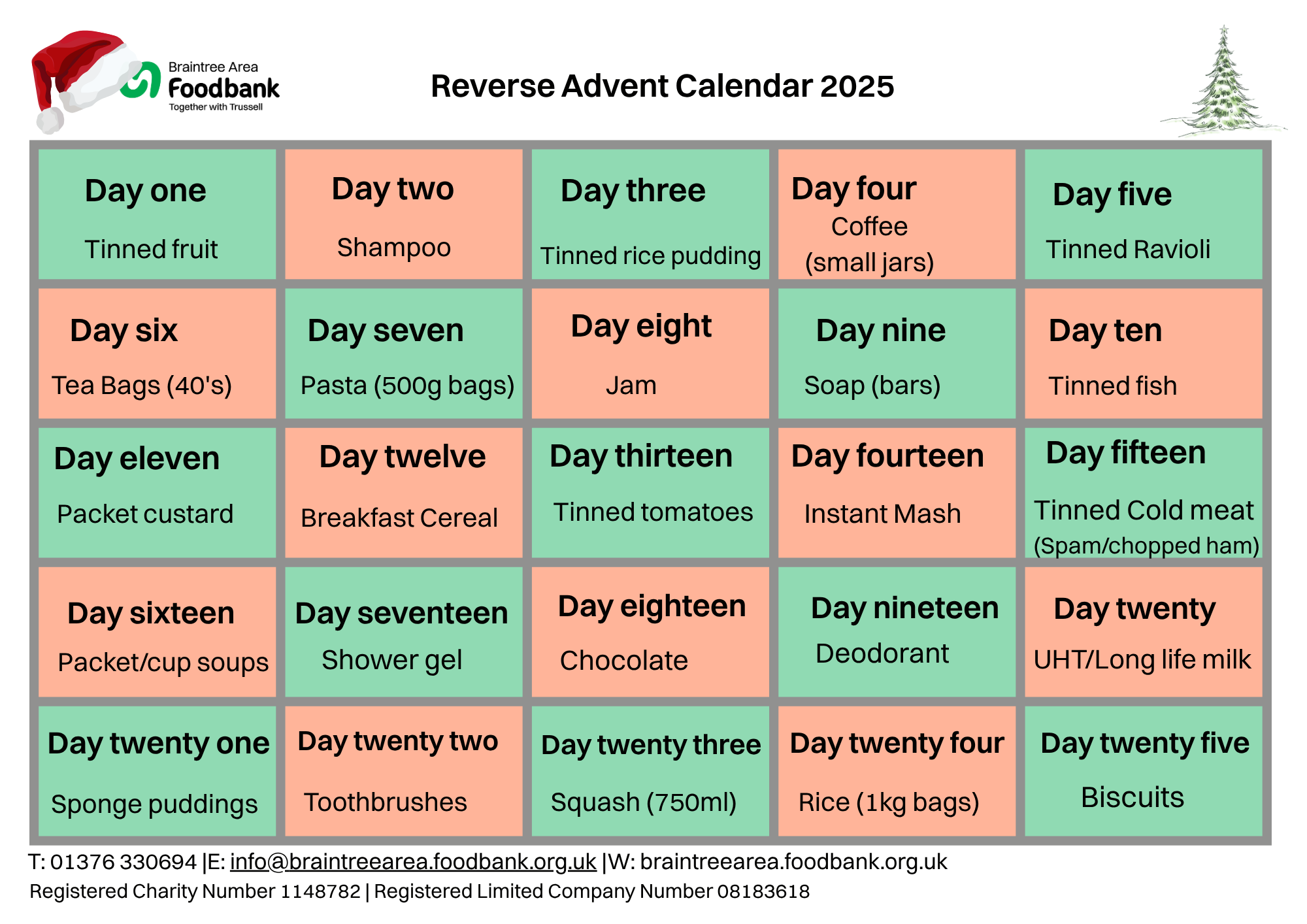 Each day, for twenty five days, you collect an items from the list and save them. By collecting from our Advent calendar you will collect twenty five of our most needed food items.  Once  you have all twenty five foods you donate them to us.